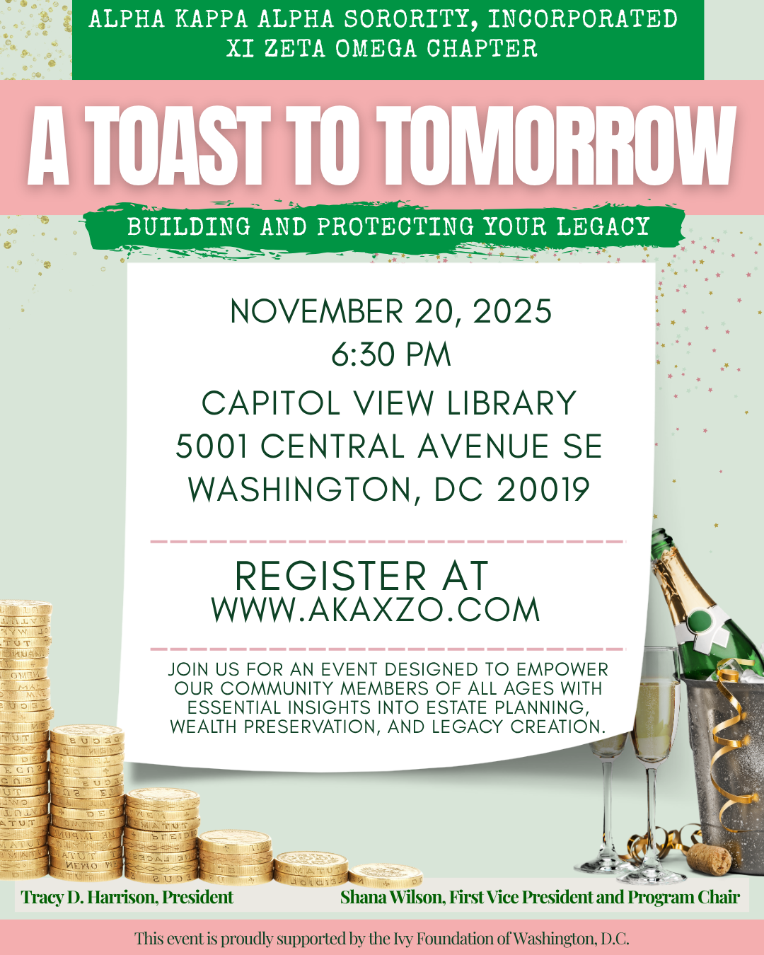 Join the Xi Zeta Omega Chapter of Alpha Kappa Alpha Sorority, Incorporated for A Toast to Tomorrow: Building and Protecting Your Legacy—a free, community-centered panel discussion focused on estate planning and long-term financial wellness.